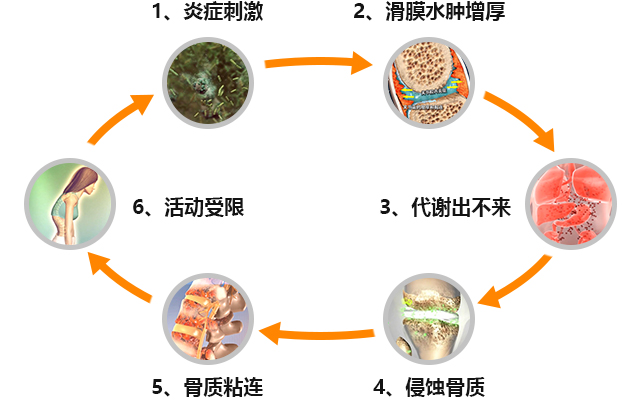 无菌性炎症随血液循环附着到关节囊上,反复刺激,导致滑膜水肿充血、增厚,形成代谢产物出不来,营养进不去的封闭状态,关节软骨、韧带肌腱等组织受到侵蚀,骨质粘连,骨关节软骨破坏,进而活动受限产生。