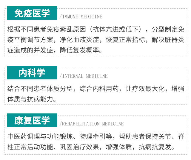 上海强直医院免疫调节中心,由免疫学、康复学、内科学专家入驻,整合国际最新免疫吸附技术,结合免疫学、康复医学专家调节机体免疫平衡,再结合内科学、康复医学专家科学配以药物巩固病情、积极锻炼建立抗复发机制,帮助病情反复患者全面调节机体免疫平衡,避免终身药物依赖。